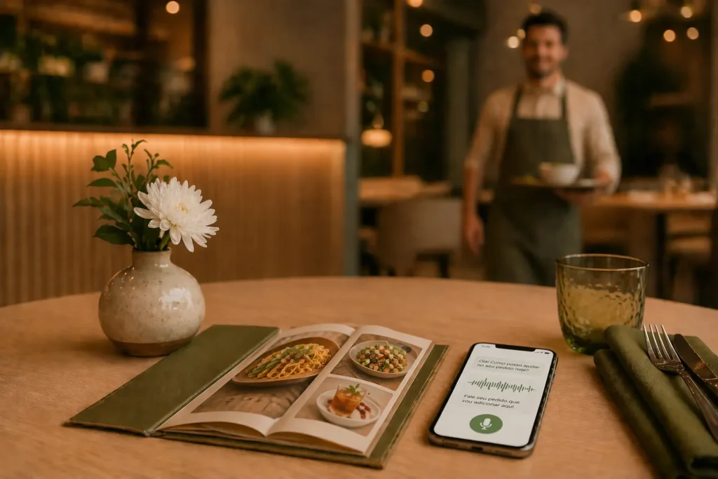 Mesa de restaurante moderna vista de cima com cardápio aberto, celular com interface de pedido por voz e garçom ao fundo desfocadoTecnologia de pedidos por voz integrada à experiência do restaurante, mantendo o atendimento humano e acolhedor.
